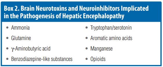 Other potential neurotoxins: taurine, opiods, melatonin, methanthiols, short-chain fatty acids. Support for the active contribution to HE is inconsistent.